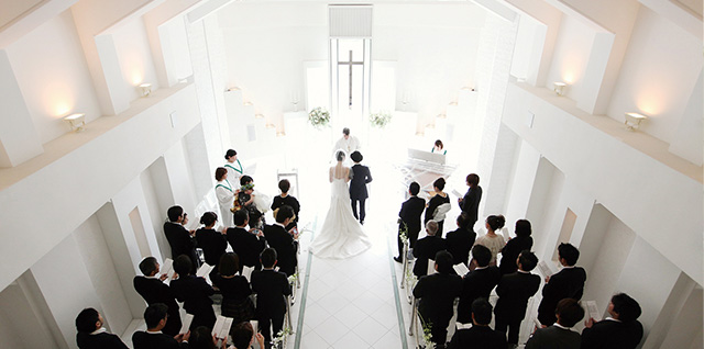 福岡の緑あふれる高級住宅街、浄水通りにひっそりと佇むチャペル「ブランネージュ」。「まっしろな雪」の名前を持つその空間は、透明な光に満たされジュエリーのような輝きをはなっています。挙式は神聖で厳格なキリスト教プロテスタント式、また宗教に関係なく、これまでお世話になった方々の前で永遠の愛を誓う人前式が執り行われます。