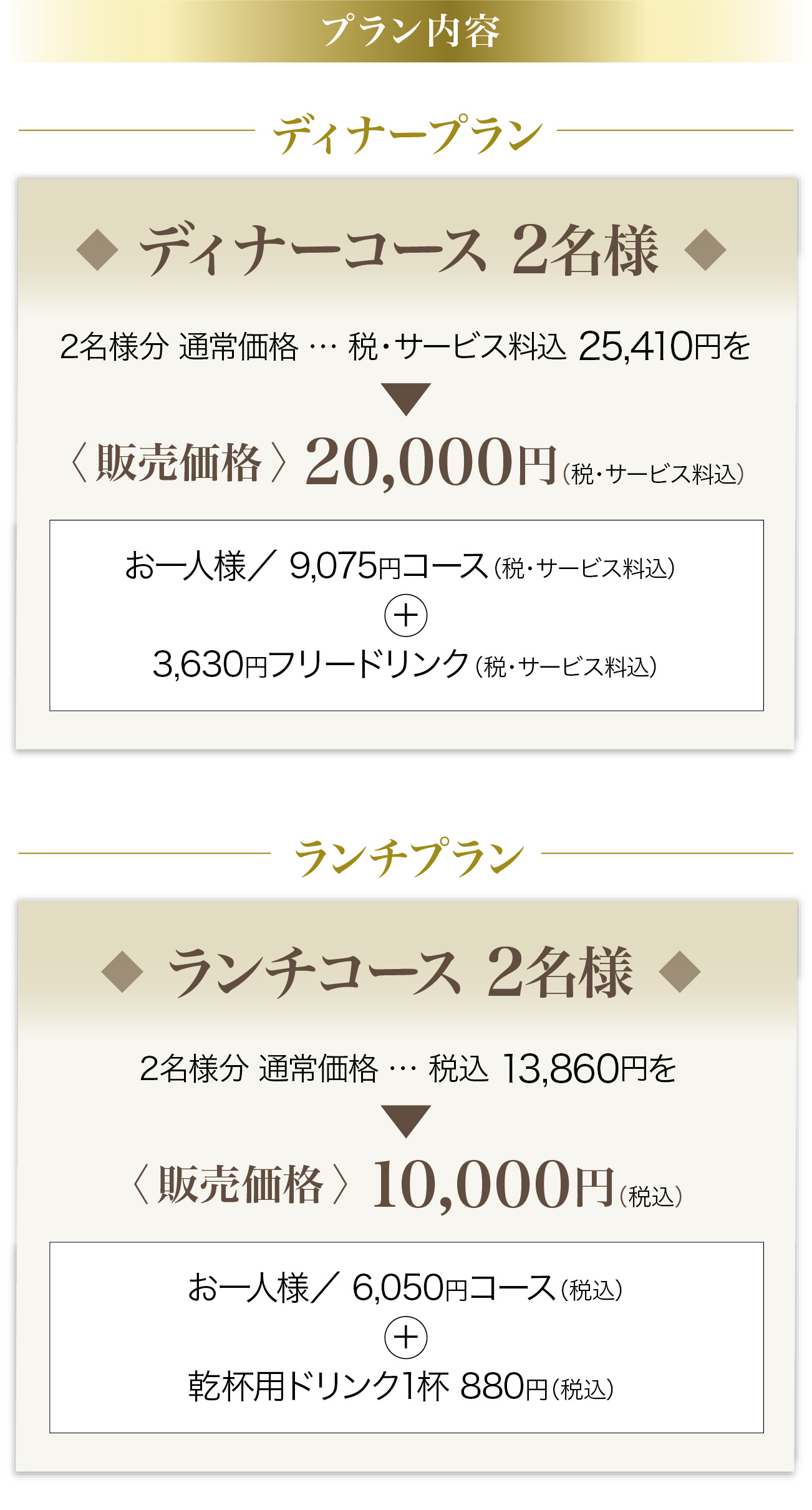 日頃の感謝の気持ちを込めて、お得意様限定の特別プランを2コースご用意いたしました。 この機会に、ぜひ私たち自慢のお料理と贅沢なひとときをお楽しみください。