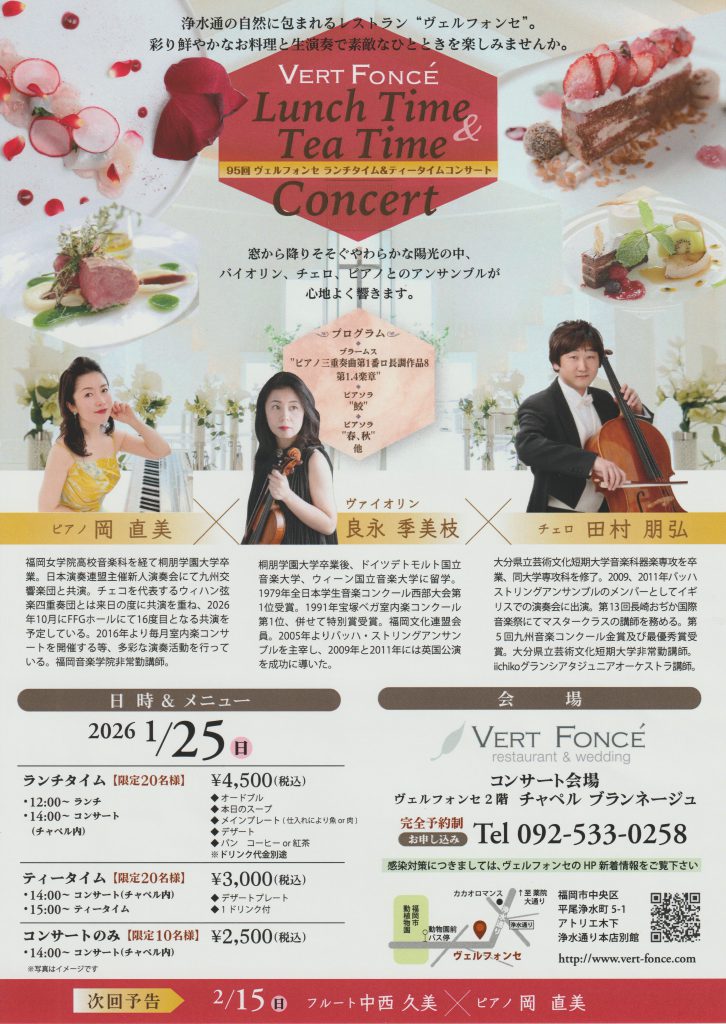 2026年第1回目のコンサートはヴァイオリンとチェロ、ピアノのアンサンブルでお届けします ランチ、ティータイムそれぞれ限定25組のご案内となります 皆様のご利用お待ちしております!